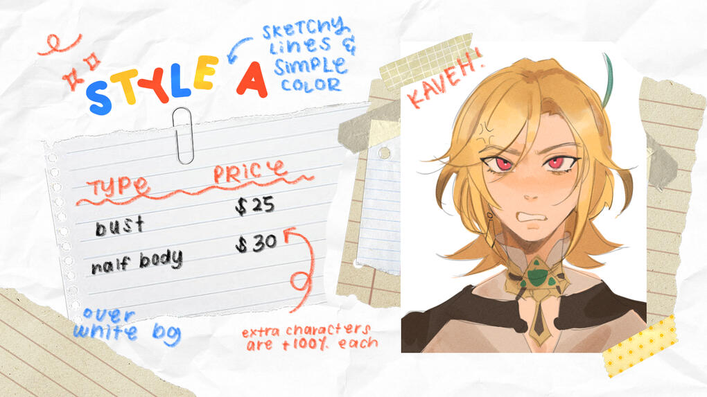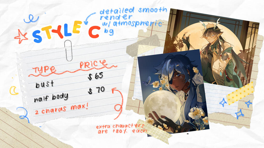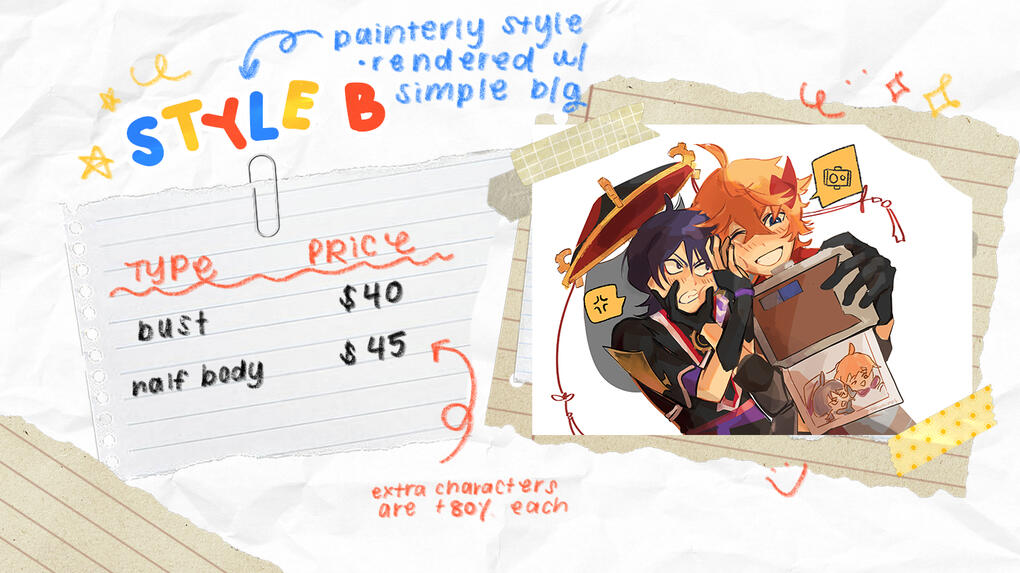 - I will not accept rush commissions whose deadlines are less than 6 days away※ Rough sketches are rough! They'll be used to map out the pose and are not indicative of the final product. The process is better highlighted in this example photo here.